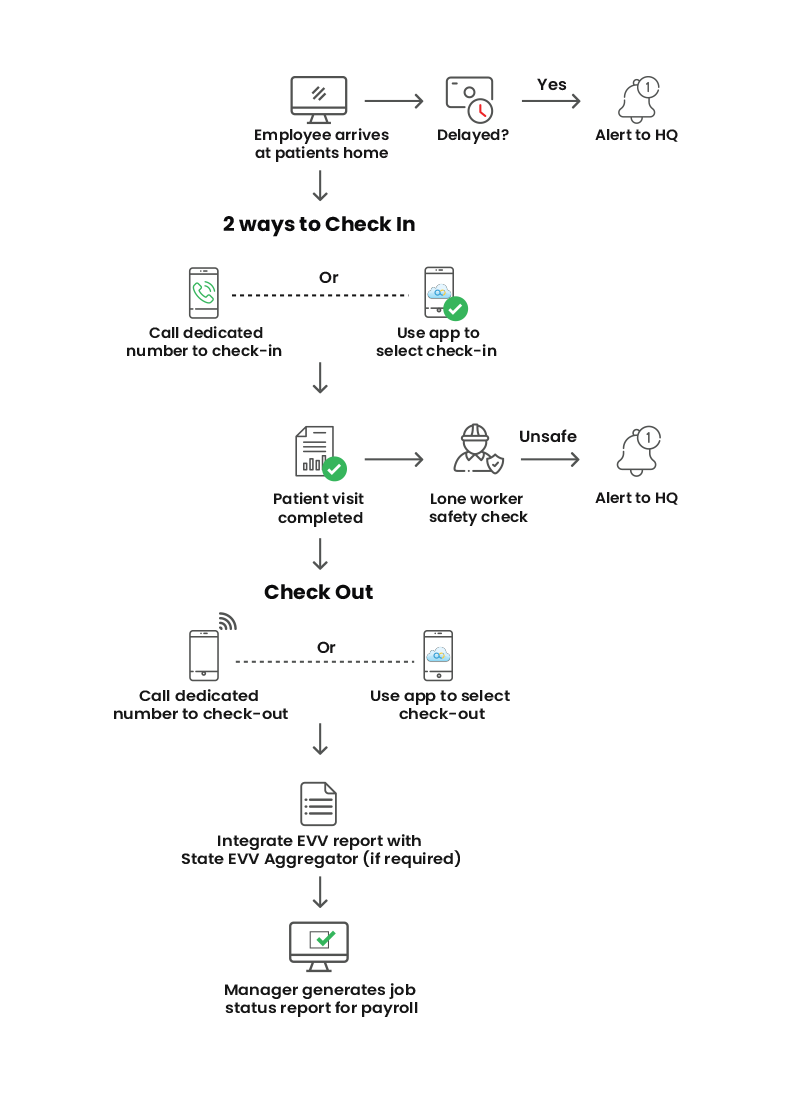 The HR & Ops manager at the headquarters is able to now generate a EVV report and job status report for payroll at the end of each day or payroll period. No more cumbersome paper trail and delays in processing payroll and project invoices.